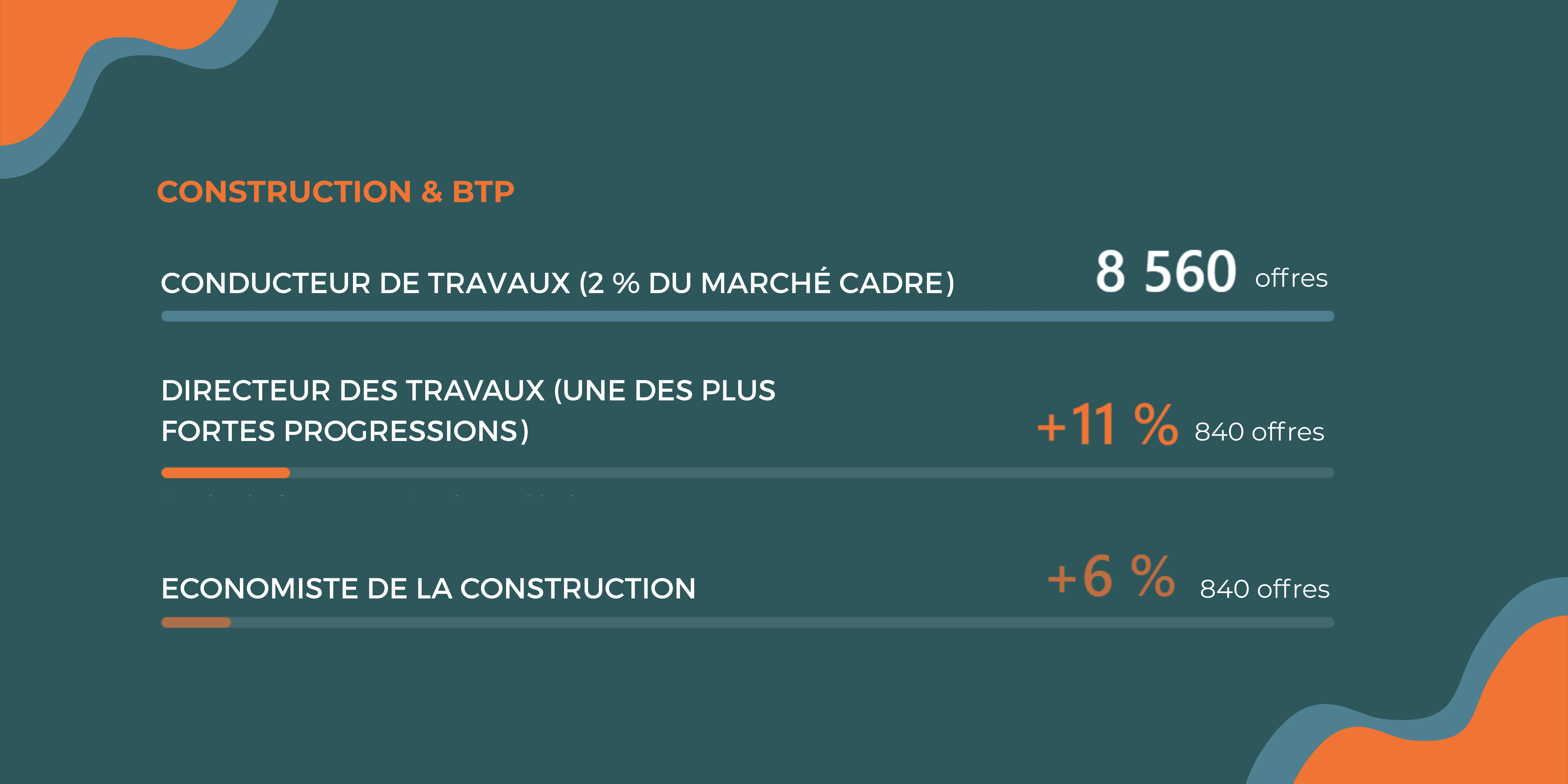 Deux métiers en particulier se distinguent cette année. Le métier de directeur de travaux enregistre une hausse de 11 % des offres en 2025, ce qui en fait l’un des profils les plus dynamiques du classement. Le métier économiste de la construction progresse lui aussi de 6 %, confirmant un besoin croissant de professionnels capables de chiffrer et d’optimiser les projets de construction.